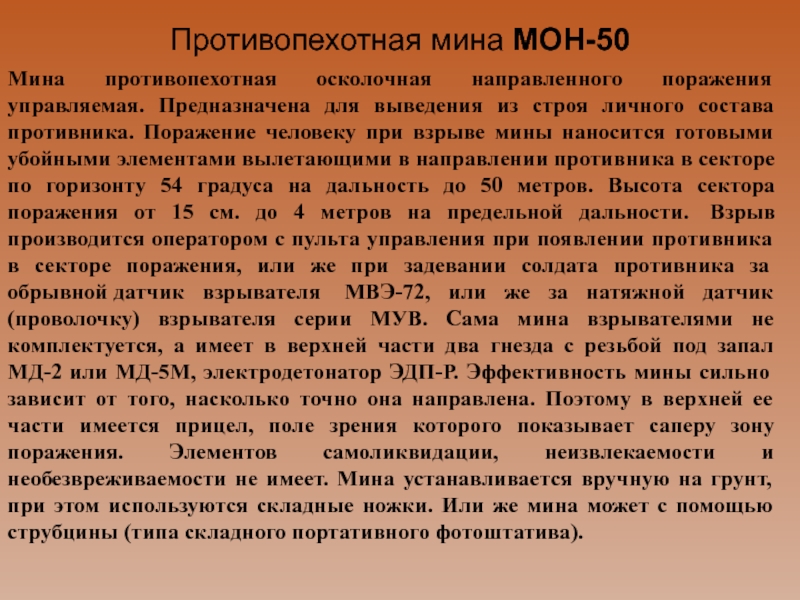 из строя личного состава противника. Поражение человеку при взрыве мины наносится готовыми убойными элементами вылетающими в направлении противника в секторе по горизонту 54 градуса на дальность до 50 метров. Высота сектора поражения от 15 см. до 4 метров на предельной дальности. Взрыв производится оператором с пульта управления при появлении противника в секторе поражения, или же при задевании солдата противника за обрывной датчик взрывателя МВЭ-72, или же за натяжной датчик (проволочку) взрывателя серии МУВ. Сама мина взрывателями не комплектуется, а имеет в верхней части два гнезда с резьбой под запал МД-2 или МД-5М, электродетонатор ЭДП-Р. Эффективность мины сильно зависит от того, насколько точно она направлена. Поэтому в верхней ее части имеется прицел, поле зрения которого показывает саперу зону поражения. Элементов самоликвидации, неизвлекаемости и необезвреживаемости не имеет. Мина устанавливается вручную на грунт, при этом используются складные ножки. Или же мина может с помощью струбцины (типа складного портативного фотоштатива).