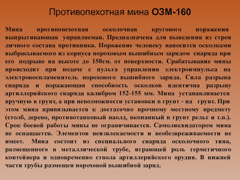 выведения из строя личного состава противника. Поражение человеку наносится осколками выбрасываемого из корпуса пороховым вышибным зарядом снаряда при его подрыве на высоте до 150см. от поверхности. Срабатывание мины происходит при подаче с пульта управления электроимпульса на электровоспламенитель порохового вышибного заряда. Сила разрыва снаряда и поражающая способность осколков идентична разрыву артиллерийского снаряда калибром 152-155 мм. Мина устанавливается вручную в грунт, а при невозможности установки в грунт - на грунт. При этом мина привязывается к достаточно прочному местному предмету(столб, дерево, противотанковый наолд, вкопанный в грунт рельс и т.п.). Срок боевой работы мины не ограничивается. Самоликвидатором мина не оснащается. Элементов неизвлекаемости и необезвреживаемости не имеет. Мина состоит из специального снаряда осколочного типа, размещенного в металлической трубе, играющей роль герметичного контейнера и одновременно ствола артиллерийского орудия. В нижней части трубы размещен пороховой вышибной заряд.