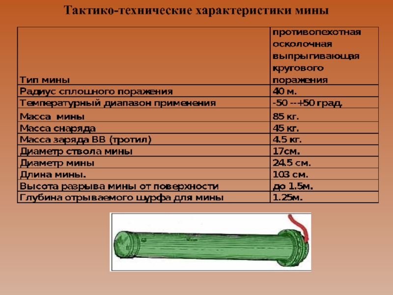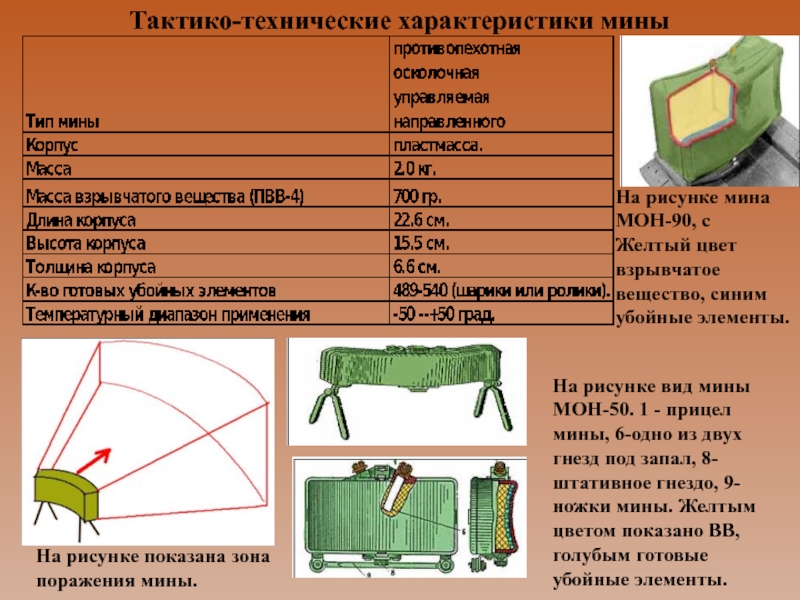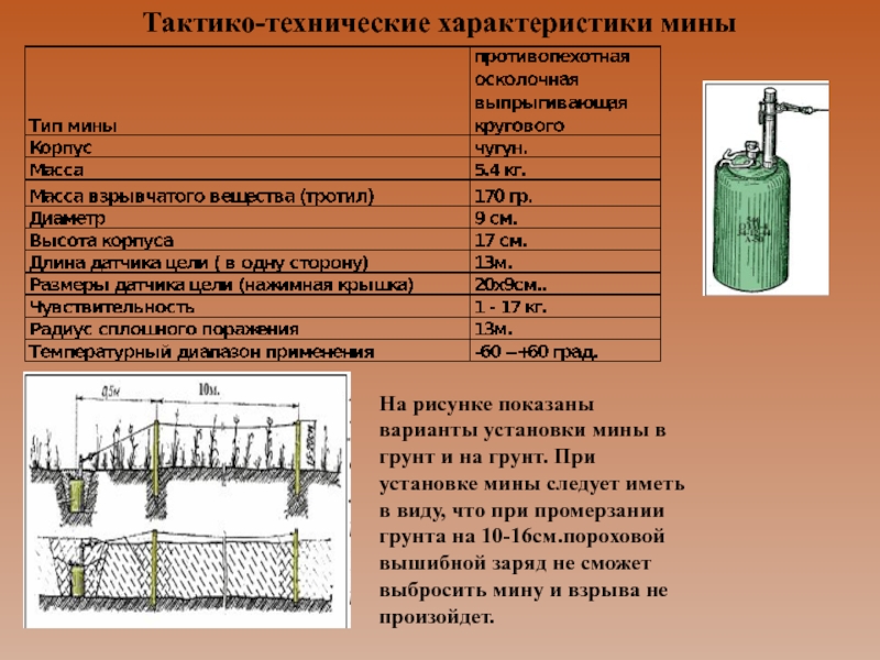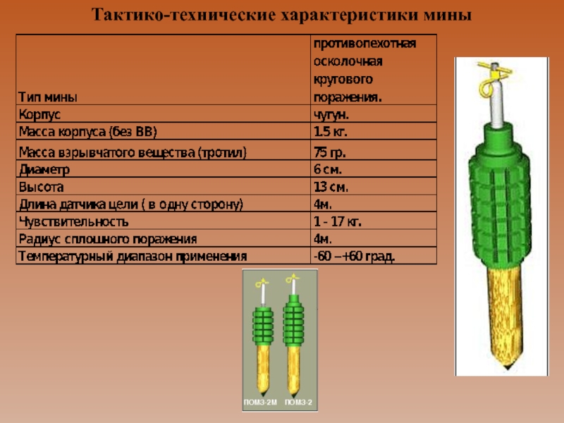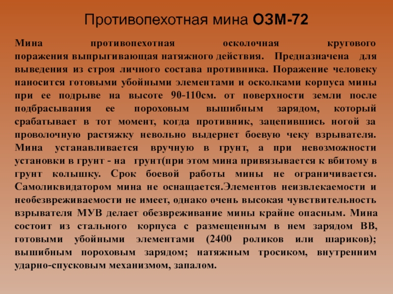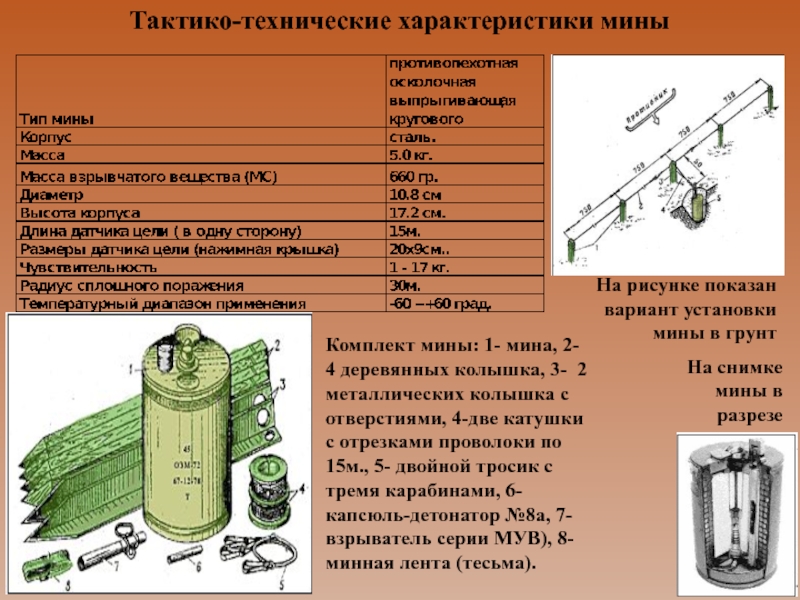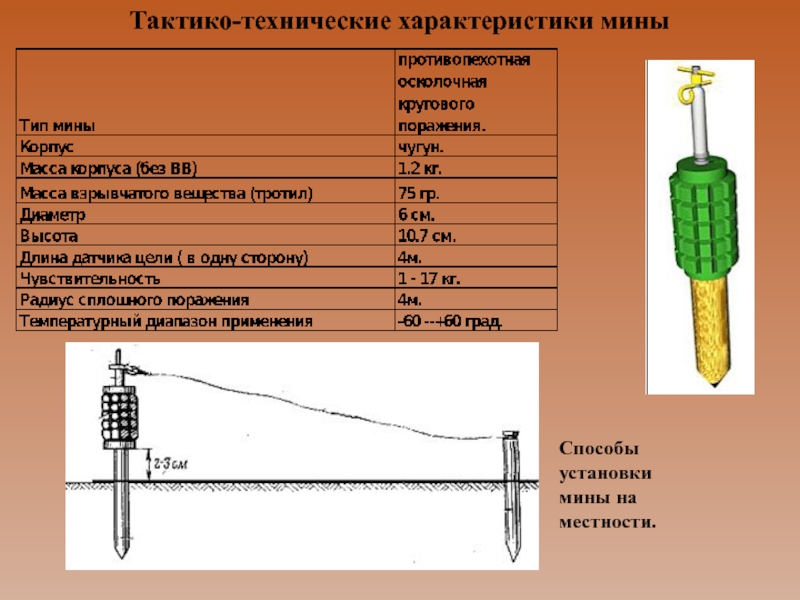 Слайд 67Мина противопехотная осколочная натяжного действия. Предназначена для выведения из строя личного