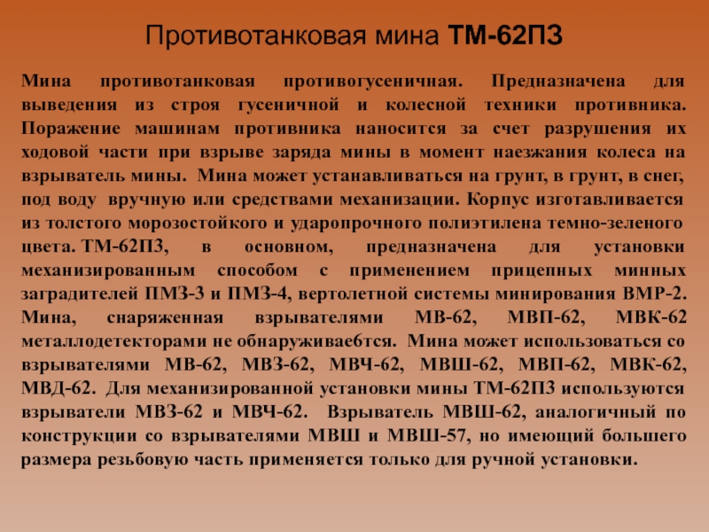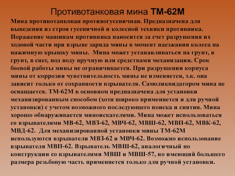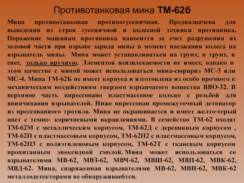 гусеничной и колесной техники противника. Поражение машинам противника наносится за счет разрушения их ходовой части при взрыве заряда мины в момент наезжания колеса на взрыватель мины. Мина может устанавливаться на грунт, в грунт, в снег, только вручную. Элементов неизвлекаемости не имеет, однако в этом качестве с миной может использоваться мина-сюрприз МС-3 или МС-4. Мина ТМ-62Б не имеет корпуса и изготовлена из особо прочного к механическим воздействиям твердого взрывчатого вещества ВВО-32. В верхнюю часть впрессовано пластмассовое кольцо с резьбой для ввинчивания взрывателей. Ниже впрессован промежуточный детонатор из прессованного тротила. Мина не окрашивается и имеет желто-серый цвет с темно- коричневыми вкраплениями. В семейство ТМ-62 входят ТМ-62М с металлическим корпусом, ТМ-62Д с деревянным корпусом , ТМ-62П с пластмассовым корпусом, ТМ-62П2 с пластмассовым корпусом, ТМ-62П3 с полиэтиленовым корпусом, ТМ-62Т с тканевым корпусом пропитанным эпоксидной смолой. Мина может использоваться со взрывателями МВ-62, МВЗ-62, МВЧ-62, МВШ-62, МВП-62, МВК-62, МВД-62. Мина, снаряженная взрывателями МВ-62, МВП-62, МВК-62 металлодетекторами не обнаруживае6тся.