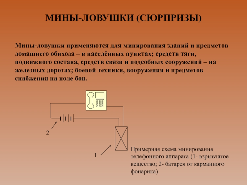 Примерная схема минирования телефонного аппарата (1- взрывчатое вещество; 2- батарея от карманного фонарика)