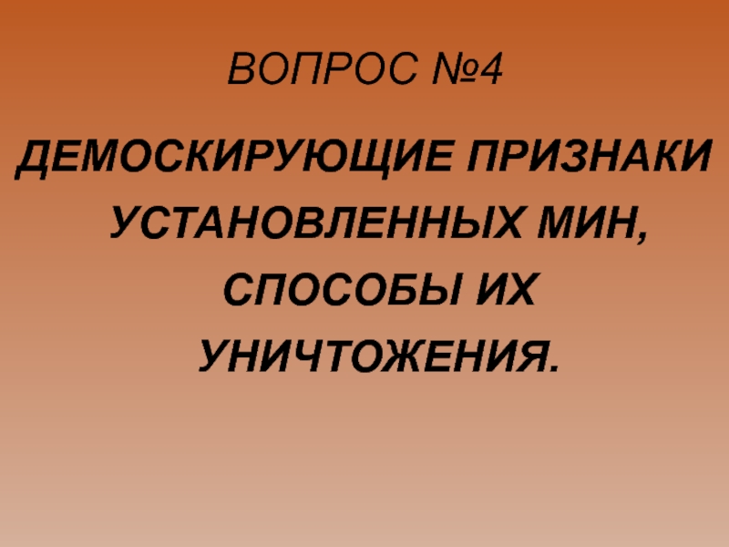 Слайд 78ДЕМОСКИРУЮЩИЕ ПРИЗНАКИ УСТАНОВЛЕННЫХ МИН, СПОСОБЫ ИХ УНИЧТОЖЕНИЯ.