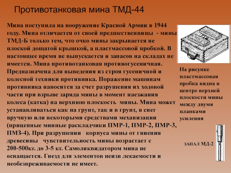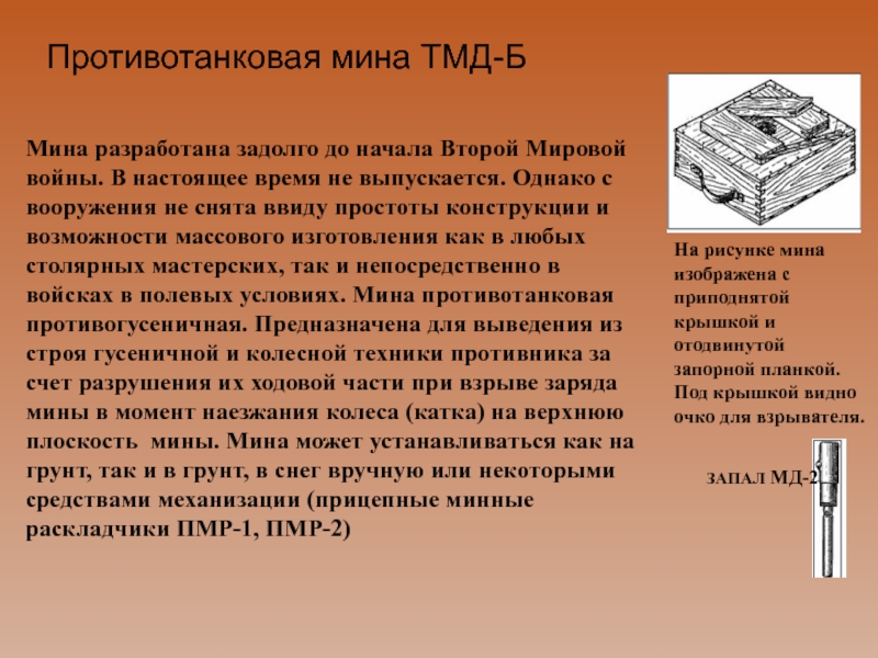 году. Мина отличается от своей предшественницы - мины ТМД-Б только тем, что очко мины закрывается не плоской дощатой крышкой, а пластмассовой пробкой. В настоящее время не выпускается и запасов на складах не имеется. Мина противотанковая противогусеничная. Предназначена для выведения из строя гусеничной и колесной техники противника. Поражение машинам противника наносится за счет разрушения их ходовой части при взрыве заряда мины в момент наезжания колеса (катка) на верхнюю плоскость мины. Мина может устанавливаться как на грунт, так и в грунт, в снег вручную или некоторыми средствами механизации (прицепные минные раскладчики ПМР-1, ПМР-2, ПМР-3, ПМЗ-4). При разрушении корпуса мины от гниения древесины чувствительность мины возрастает с 200-500кг. до 3-5 кг. Самоликвидатором мина не оснащается. Гнезд для элементов неизв лекаемости и необезвреживаемости не имеет.