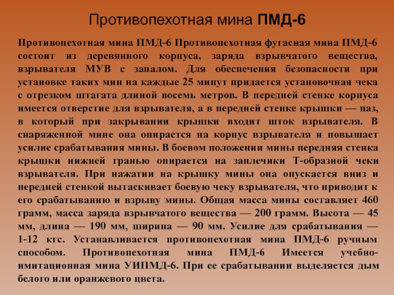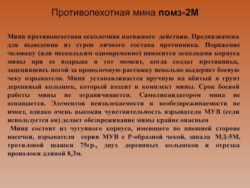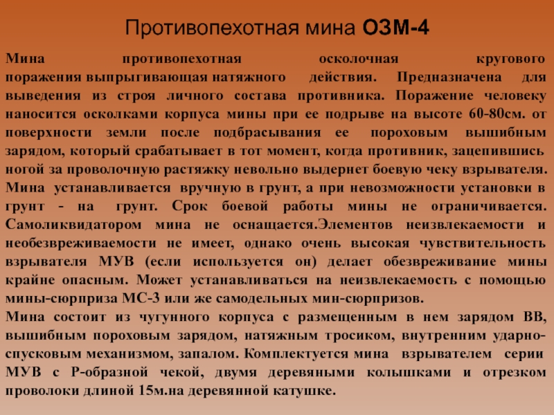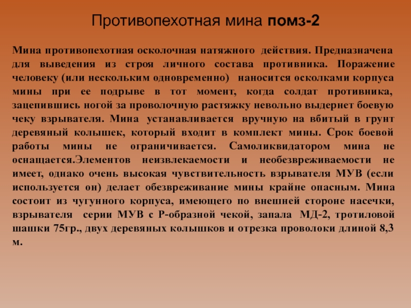 строя личного состава противника. Поражение человеку (или нескольким одновременно) наносится осколками корпуса мины при ее подрыве в тот момент, когда солдат противника, зацепившись ногой за проволочную растяжку невольно выдернет боевую чеку взрывателя. Мина устанавливается вручную на вбитый в грунт деревяный колышек, который входит в комплект мины. Срок боевой работы мины не ограничивается. Самоликвидатором мина не оснащается.Элементов неизвлекаемости и необезвреживаемости не имеет, однако очень высокая чувствительность взрывателя МУВ (если используется он) делает обезвреживание мины крайне опасным. Мина состоит из чугунного корпуса, имеющего по внешней стороне насечки, взрывателя серии МУВ с Р-образной чекой, запала МД-2, тротиловой шашки 75гр., двух деревяных колышков и отрезка проволоки длиной 8,3м.