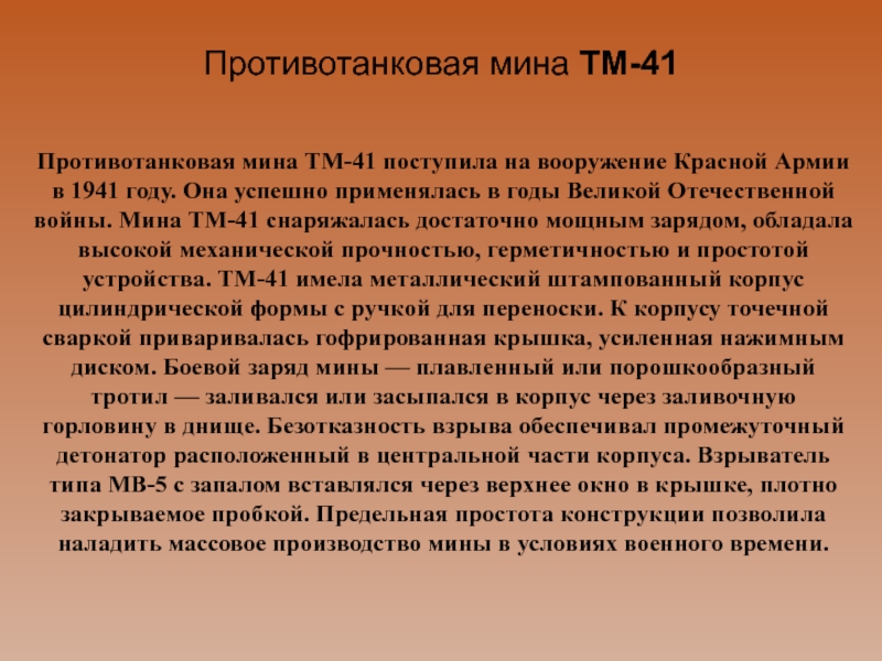 в 1941 году. Она успешно применялась в годы Великой Отечественной войны. Мина ТМ-41 снаряжалась достаточно мощным зарядом, обладала высокой механической прочностью, герметичностью и простотой устройства. ТМ-41 имела металлический штампованный корпус цилиндрической формы с ручкой для переноски. К корпусу точечной сваркой приваривалась гофрированная крышка, усиленная нажимным диском. Боевой заряд мины — плавленный или порошкообразный тротил — заливался или засыпался в корпус через заливочную горловину в днище. Безотказность взрыва обеспечивал промежуточный детонатор расположенный в центральной части корпуса. Взрыватель типа МВ-5 с запалом вставлялся через верхнее окно в крышке, плотно закрываемое пробкой. Предельная простота конструкции позволила наладить массовое производство мины в условиях военного времени.