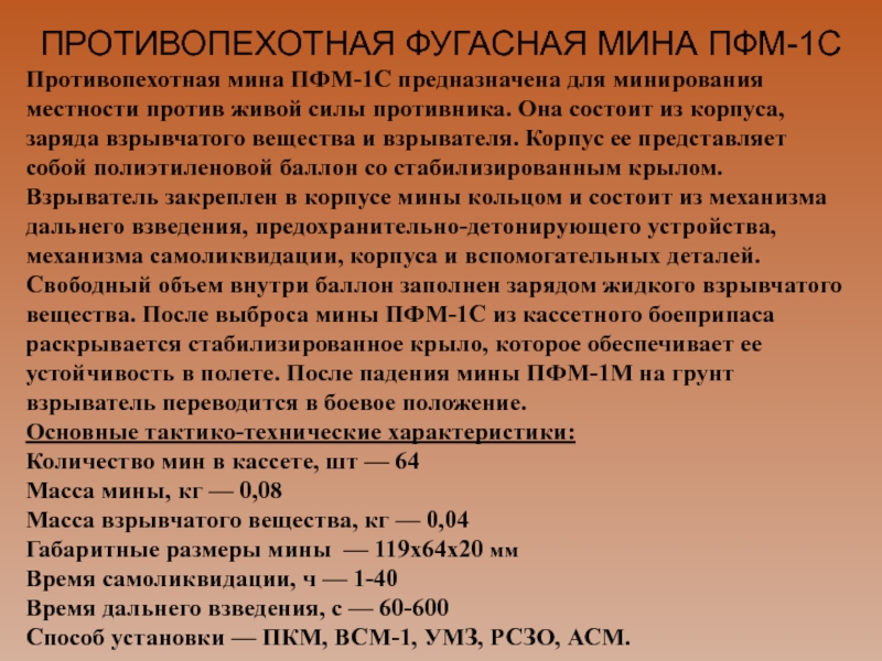 живой силы противника. Она состоит из корпуса, заряда взрывчатого вещества и взрывателя. Корпус ее представляет собой полиэтиленовой баллон со стабилизированным крылом. Взрыватель закреплен в корпусе мины кольцом и состоит из механизма дальнего взведения, предохранительно-детонирующего устройства, механизма самоликвидации, корпуса и вспомогательных деталей. Свободный объем внутри баллон заполнен зарядом жидкого взрывчатого вещества. После выброса мины ПФМ-1С из кассетного боеприпаса раскрывается стабилизированное крыло, которое обеспечивает ее устойчивость в полете. После падения мины ПФМ-1М на грунт взрыватель переводится в боевое положение.