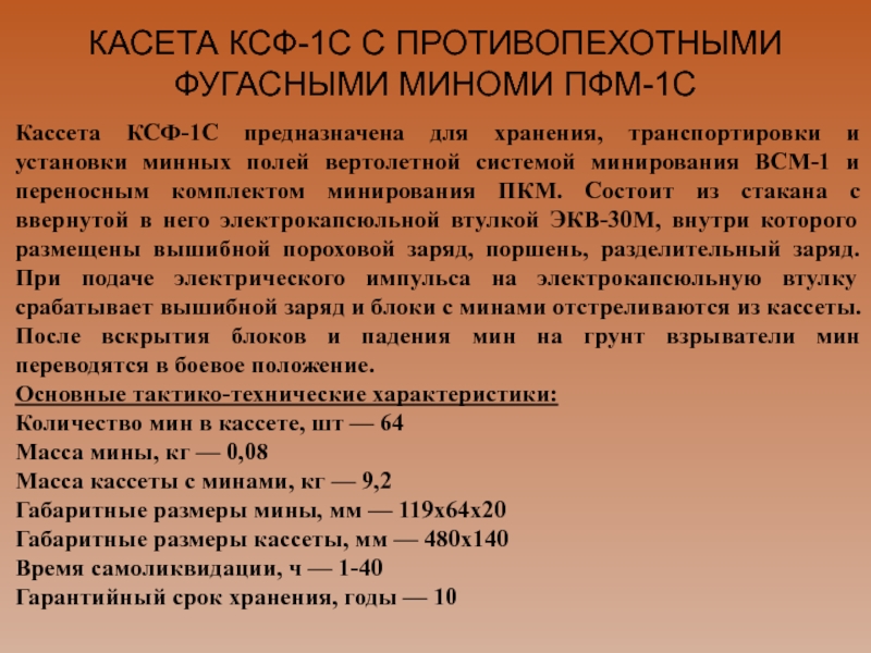 Слайд 53КАСЕТА КСФ-1С С ПРОТИВОПЕХОТНЫМИ ФУГАСНЫМИ МИНОМИ ПФМ-1С