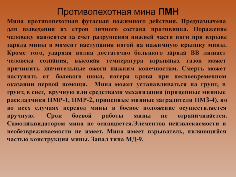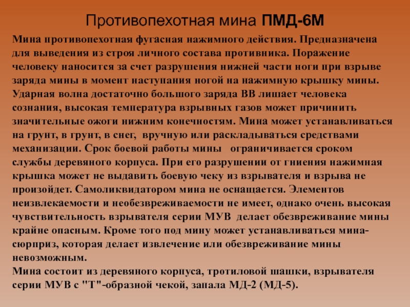 состава противника. Поражение человеку наносится за счет разрушения нижней части ноги при взрыве заряда мины в момент наступания ногой на нажимную крышку мины. Ударная волна достаточно большого заряда ВВ лишает человека сознания, высокая температура взрывных газов может причинить значительные ожоги нижним конечностям. Мина может устанавливаться на грунт, в грунт, в снег, вручную или раскладываться средствами механизации. Срок боевой работы мины ограничивается сроком службы деревяного корпуса. При его разрушении от гниения нажимная крышка может не выдавить боевую чеку из взрывателя и взрыва не произойдет. Самоликвидатором мина не оснащается. Элементов неизвлекаемости и необезвреживаемости не имеет, однако очень высокая чувствительность взрывателя серии МУВ делает обезвреживание мины крайне опасным. Кроме того под мину может устанавливаться мина-сюрприз, которая делает извлечение или обезвреживание мины невозможным.