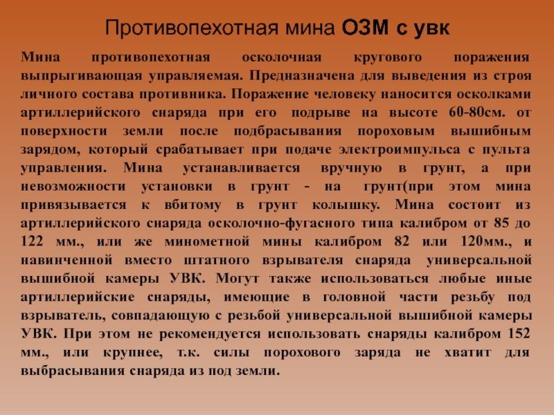 Предназначена для выведения из строя личного состава противника. Поражение человеку наносится осколками артиллерийского снаряда при его подрыве на высоте 60-80см. от поверхности земли после подбрасывания пороховым вышибным зарядом, который срабатывает при подаче электроимпульса с пульта управления. Мина устанавливается вручную в грунт, а при невозможности установки в грунт - на грунт(при этом мина привязывается к вбитому в грунт колышку. Мина состоит из артиллерийского снаряда осколочно-фугасного типа калибром от 85 до 122 мм., или же минометной мины калибром 82 или 120мм., и навинченной вместо штатного взрывателя снаряда универсальной вышибной камеры УВК. Могут также использоваться любые иные артиллерийские снаряды, имеющие в головной части резьбу под взрыватель, совпадающую с резьбой универсальной вышибной камеры УВК. При этом не рекомендуется использовать снаряды калибром 152 мм., или крупнее, т.к. силы порохового заряда не хватит для выбрасывания снаряда из под земли.