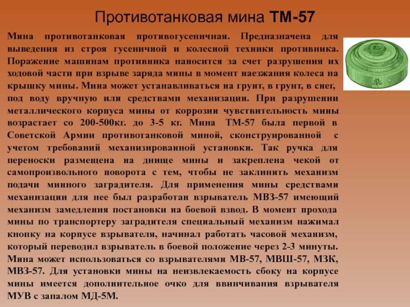 гусеничной и колесной техники противника. Поражение машинам противника наносится за счет разрушения их ходовой части при взрыве заряда мины в момент наезжания колеса на крышку мины. Мина может устанавливаться на грунт, в грунт, в снег, под воду вручную или средствами механизации. При разрушении металлического корпуса мины от коррозии чувствительность мины возрастает со 200-500кг. до 3-5 кг. Мина ТМ-57 была первой в Советской Армии противотанковой миной, сконструированной с учетом требований механизированной установки. Так ручка для переноски размещена на днище мины и закреплена чекой от самопроизвольного поворота с тем, чтобы не заклинить механизм подачи минного заградителя. Для применения мины средствами механизации для нее был разработан взрыватель МВЗ-57 имеющий механизм замедления постановки на боевой взвод. В момент прохода мины по транспортеру заградителя специальный механизм нажимал кнопку на корпусе взрывателя, начинал работать часовой механизм, который переводил взрыватель в боевой положение через 2-3 минуты. Мина может использоваться со взрывателями МВ-57, МВШ-57, МЗК, МВЗ-57. Для установки мины на неизвлекаемость сбоку на корпусе мины имеется дополнительное очко для ввинчивания взрывателя МУВ с запалом МД-5М.
