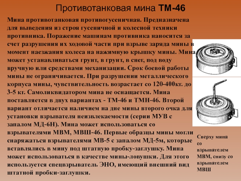 гусеничной и колесной техники противника. Поражение машинам противника наносится за счет разрушения их ходовой части при взрыве заряда мины в момент наезжания колеса на нажимную крышку мины. Мина может устанавливаться грунт, в грунт, в снег, под воду вручную или средствами механизации. Срок боевой работы мины не ограничивается. При разрушении металлического корпуса мины, чувствительность возрастает со 120-400кг. до 3-5 кг. Самоликвидатором мина не оснащается. Мина поставляется в двух вариантах - ТМ-46 и ТМН-46. Второй вариант отличается наличием на дне мины второго очка для установки взрывателя неизвлекаемости (серии МУВ с запалом МД-6Н). Мина может использоваться со взрывателями МВМ, МВШ-46. Первые образцы мины могли снаряжаться взрывателями МВ-5 с запалом МД-5м, которые вставлялись в мину под штатную пробку-заглушку. Мина может использоваться в качестве мины-ловушки. Для этого используется спецвзрыватель ЭНО, имеющий внешний вид штатной пробки-заглушки.