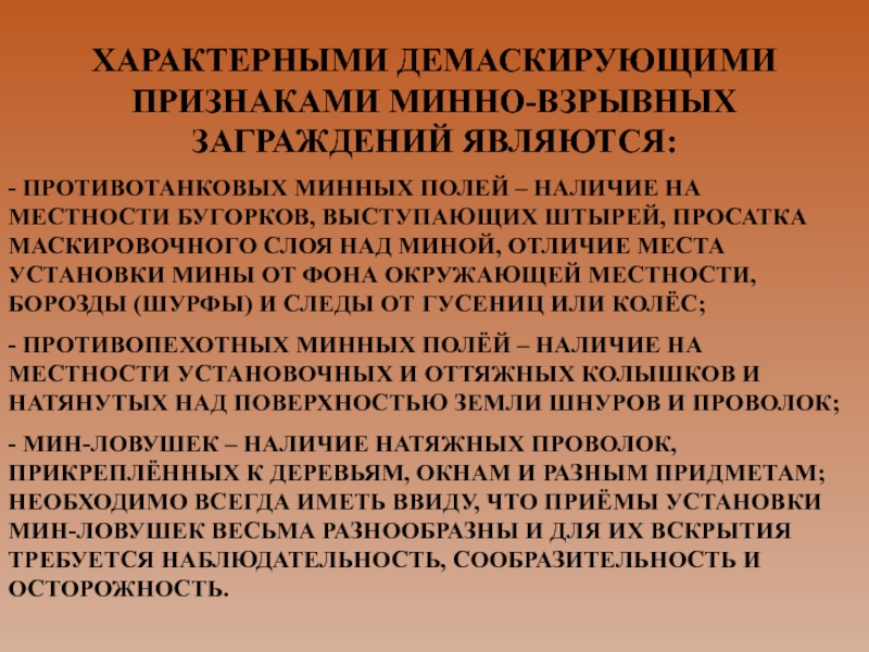 Слайд 79ХАРАКТЕРНЫМИ ДЕМАСКИРУЮЩИМИ ПРИЗНАКАМИ МИННО-ВЗРЫВНЫХ ЗАГРАЖДЕНИЙ ЯВЛЯЮТСЯ:
