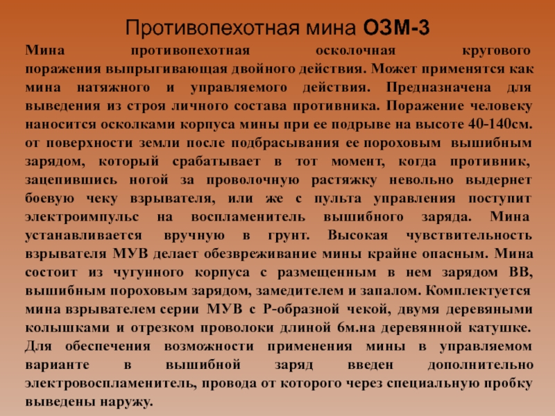 мина натяжного и управляемого действия. Предназначена для выведения из строя личного состава противника. Поражение человеку наносится осколками корпуса мины при ее подрыве на высоте 40-140см. от поверхности земли после подбрасывания ее пороховым вышибным зарядом, который срабатывает в тот момент, когда противник, зацепившись ногой за проволочную растяжку невольно выдернет боевую чеку взрывателя, или же с пульта управления поступит электроимпульс на воспламенитель вышибного заряда. Мина устанавливается вручную в грунт. Высокая чувствительность взрывателя МУВ делает обезвреживание мины крайне опасным. Мина состоит из чугунного корпуса с размещенным в нем зарядом ВВ, вышибным пороховым зарядом, замедителем и запалом. Комплектуется мина взрывателем серии МУВ с Р-образной чекой, двумя деревяными колышками и отрезком проволоки длиной 6м.на деревянной катушке. Для обеспечения возможности применения мины в управляемом варианте в вышибной заряд введен дополнительно электровоспламенитель, провода от которого через специальную пробку выведены наружу.