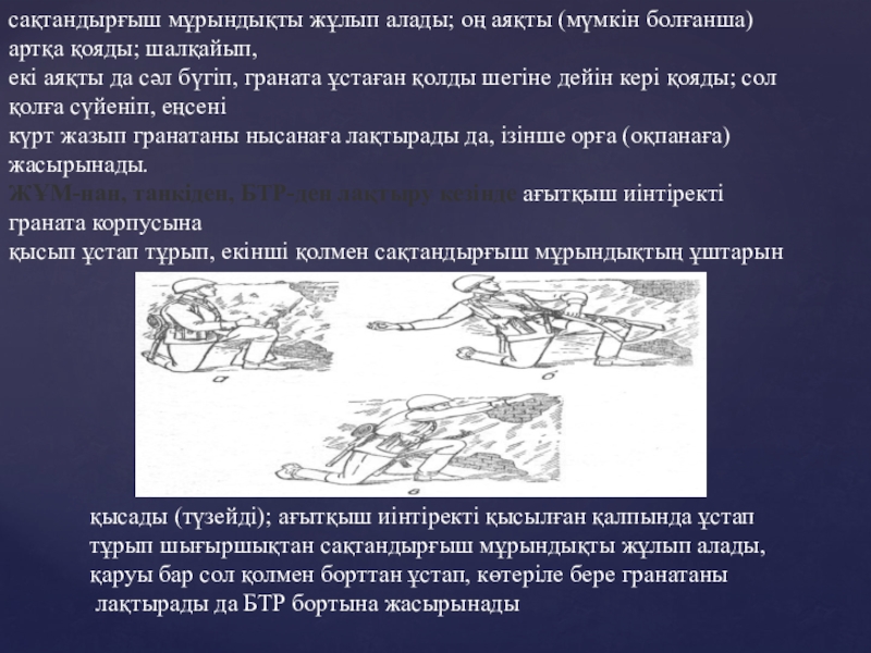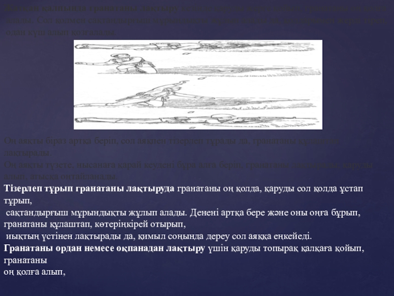 Тізерлеп тұрып гранатаны лақтыруда гранатаны оң қолда, қаруды сол қолда ұстап тұрып,