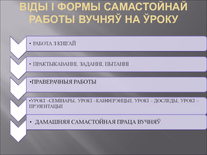 Слайд 8ВІДЫ І ФОРМЫ САМАСТОЙНАЙ РАБОТЫ ВУЧНЯЎ НА ЎРОКУ