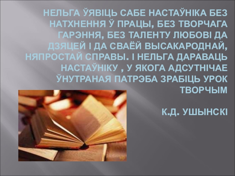 БЕЗ ТАЛЕНТУ ЛЮБОВІ ДА ДЗЯЦЕЙ І ДА СВАЁЙ ВЫСАКАРОДНАЙ, НЯПРОСТАЙ СПРАВЫ. І НЕЛЬГА ДАРАВАЦЬ НАСТАЎНІКУ , У ЯКОГА АДСУТНІЧАЕ ЎНУТРАНАЯ ПАТРЭБА ЗРАБІЦЬ УРОК ТВОРЧЫМ К.Д. УШЫНСКІ