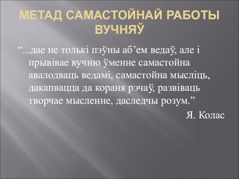 МЕТАД САМАСТОЙНАЙ РАБОТЫ ВУЧНЯЎ“...дае не толькі пэўны аб’ем ведаў, але і прывівае вучню ўменне самастойна авалодваць ведамі,