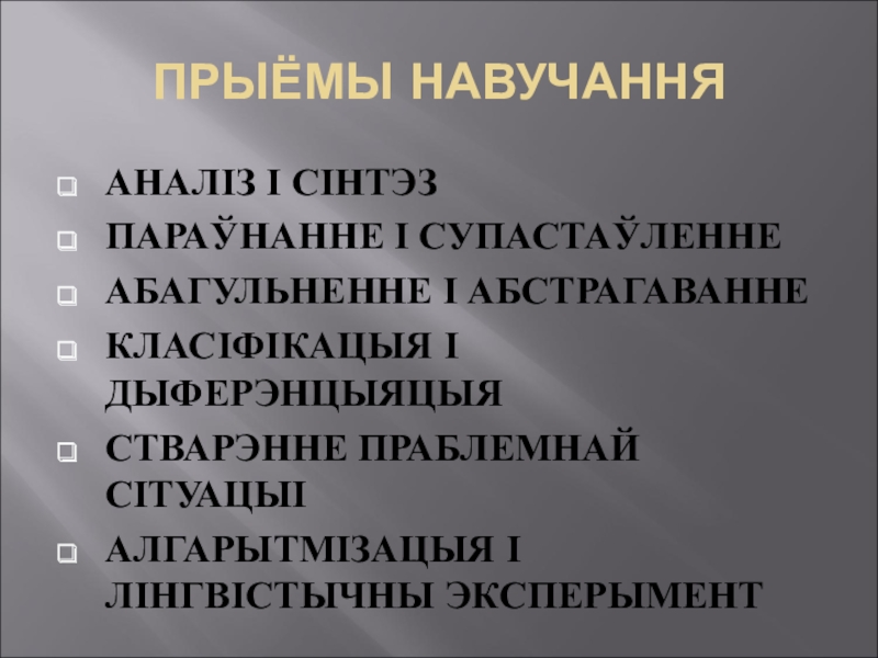 ПРЫЁМЫ НАВУЧАННЯАНАЛІЗ І СІНТЭЗПАРАЎНАННЕ І СУПАСТАЎЛЕННЕАБАГУЛЬНЕННЕ І АБСТРАГАВАННЕКЛАСІФІКАЦЫЯ І ДЫФЕРЭНЦЫЯЦЫЯСТВАРЭННЕ ПРАБЛЕМНАЙ СІТУАЦЫІАЛГАРЫТМІЗАЦЫЯ І ЛІНГВІСТЫЧНЫ ЭКСПЕРЫМЕНТ