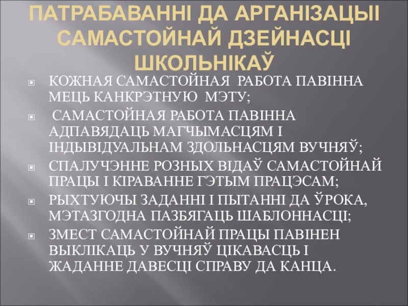 ПАТРАБАВАННІ ДА АРГАНІЗАЦЫІ САМАСТОЙНАЙ ДЗЕЙНАСЦІ ШКОЛЬНІКАЎКОЖНАЯ САМАСТОЙНАЯ РАБОТА ПАВІННА МЕЦЬ КАНКРЭТНУЮ МЭТУ; САМАСТОЙНАЯ РАБОТА ПАВІННА АДПАВЯДАЦЬ МАГЧЫМАСЦЯМ