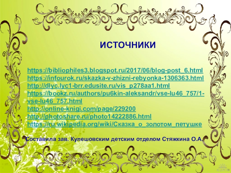 https://bibliophiles3.blogspot.ru/2017/06/blog-post_6.html https://infourok.ru/skazka-v-zhizni-rebyonka-1306363.htmlhttp://dlyc.lyc1-brr.edusite.ru/vis_p278aa1.htmlhttps://bookz.ru/authors/pu6kin-aleksandr/vse-lu46_757/1-vse-lu46_757.htmlhttp://online-knigi.com/page/229200http://photoshare.ru/photo14222886.html https://ru.wikipedia.org/wiki/Сказка_о_золотом_петушкеИСТОЧНИКИСоставила зав. Кулешовским детским отделом Стяжкина О.А.