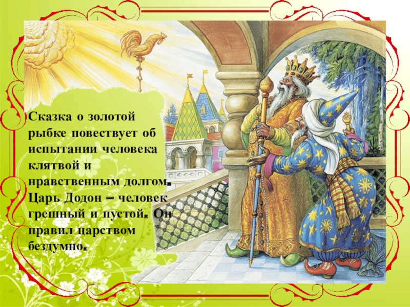 Сказка о золотой рыбке повествует об испытании человека клятвой и нравственным долгом. Царь Додон – человек грешный и пустой. Он правил царством бездумно.