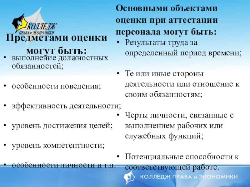 Основными объектами оценки при аттестации персонала могут быть: