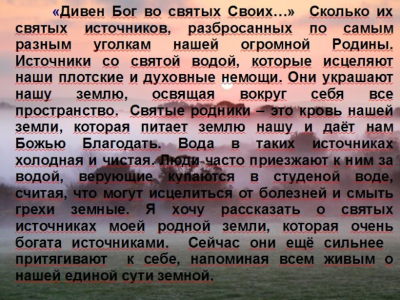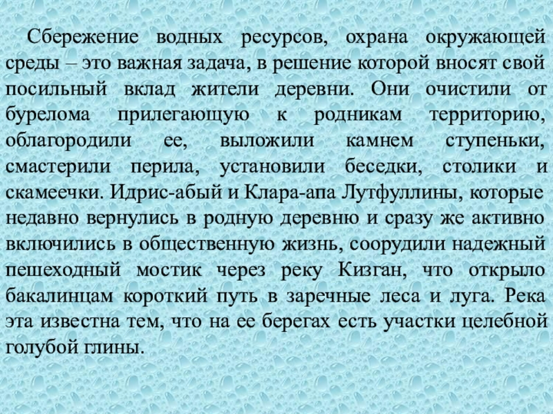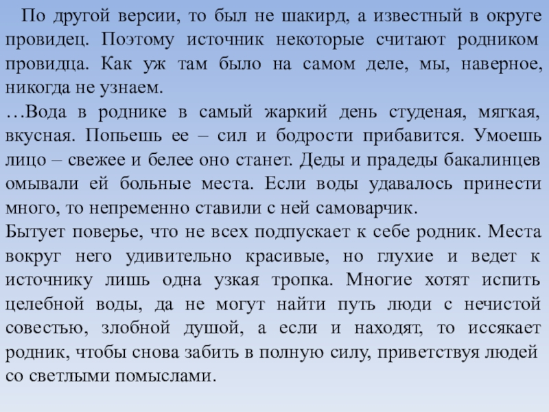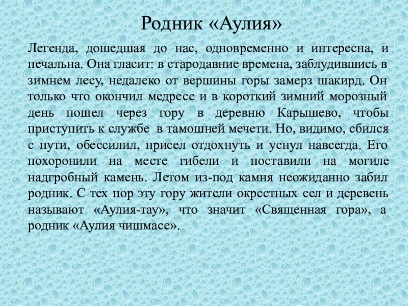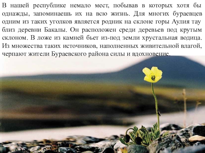 запоминаешь их на всю жизнь. Для многих бураевцев одним из таких уголков является родник на склоне горы Аулия тау близ деревни Бакалы. Он расположен среди деревьев под крутым склоном. В ложе из камней бьет из-под земли хрустальная водица. Из множества таких источников, наполненных живительной влагой, черпают жители Бураевского района силы и вдохновение.