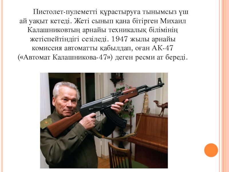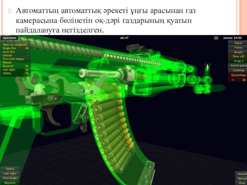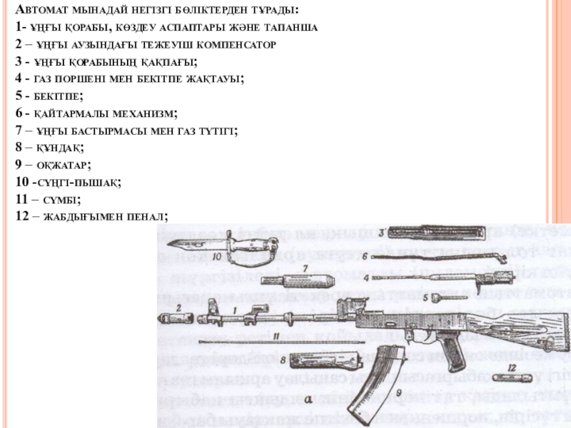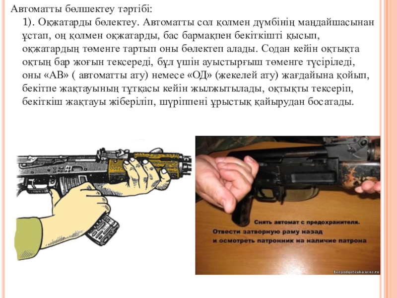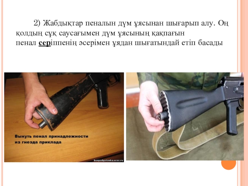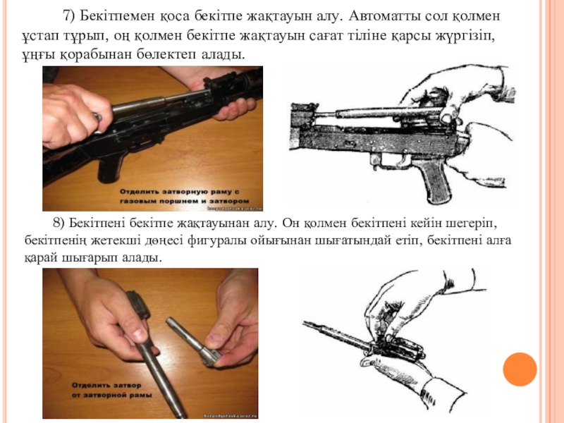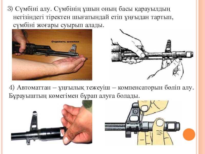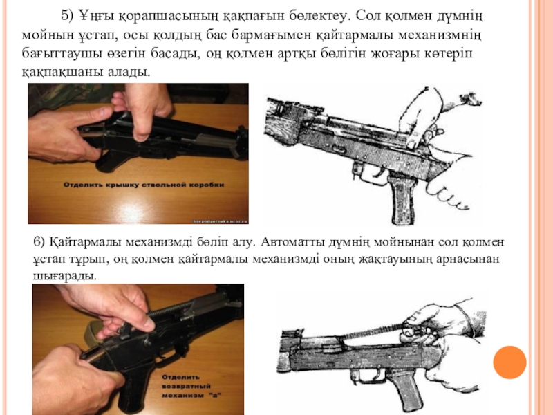 6) Қайтармалы механизмді бөліп алу. Автоматты дүмнің мойнынан сол қолмен ұстап тұрып, оң қолмен қайтармалы механизмді оның жақтауының арнасынан шығарады.