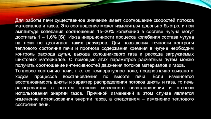 Так как тепловое состояние и степень использования энергии газов взаимно влияют друг на друга (принцип обратной связи), то параметры теплового состояния печи испытывают низкочастотные автоколебания, Так, на печах объем 1200–1400 м3 период колебаний состава чугуна составляет 16–50 ч.