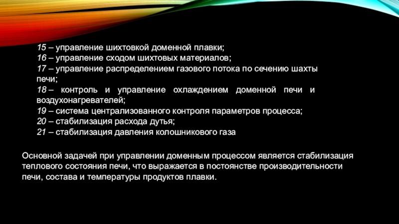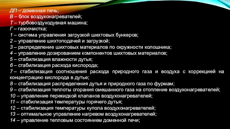 18 – контроль и управление охлаждением доменной печи и воздухонагревателей;