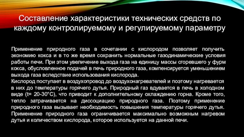 Кислород поступает в воздухопровод до воздухонагревателей и поэтому нагревается в них до температуры горячего дутья. Природный газ вдувается в печь в холодном виде (t= 20-30°С), что приводит к дополнительному охлаждению горна. Кроме того, тепло затрачивается на диссоциацию природного газа. Поэтому применение природного газа вызывает необходимость повышения температуры горячего дутья. Применение природного газа ограничивается максимально возможным нагревом дутья и количеством кислорода, которое используется на данной печи.