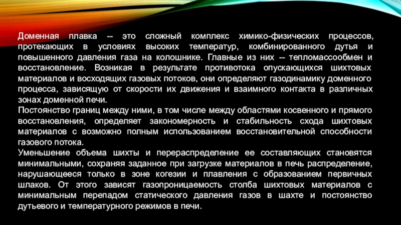 высоких температур, комбинированного дутья и повышенного давления газа на колошнике. Главные из них -- тепломассообмен и восстановление. Возникая в результате противотока опускающихся шихтовых материалов и восходящих газовых потоков, они определяют газодинамику доменного процесса, зависящую от скорости их движения и взаимного контакта в различных зонах доменной печи.