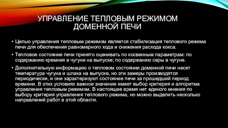 Дополнительную информацию о тепловом состоянии доменной печи несет температура чугуна и шлака на выпуске, но эти замеры производятся периодически, и они характеризуют состояние печи за прошедший период времени. В этих условиях важное значение имеет выбор критерия и алгоритма управления тепловым режимом. В настоящее время нет единого мнения по выбору критерия управления теплового режима, но можно выделить несколько направлений работ в этой области.