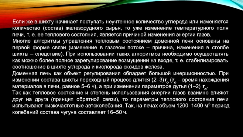 Доменная печь как объект регулирования обладает большой инерционностью. При изменении состава шихты переходный процесс длится (2–3)τo (τo – время нахождения материалов в печи, равное 5–6 ч), а при изменении параметров дутья (1–2) τo.
