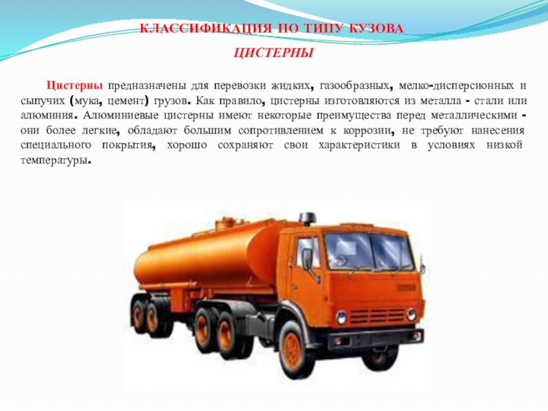 К последним относятся самосвалы, фургоны, цистерны, контейнеро-, панеле-, лесо-, цементовозы и т.п.;