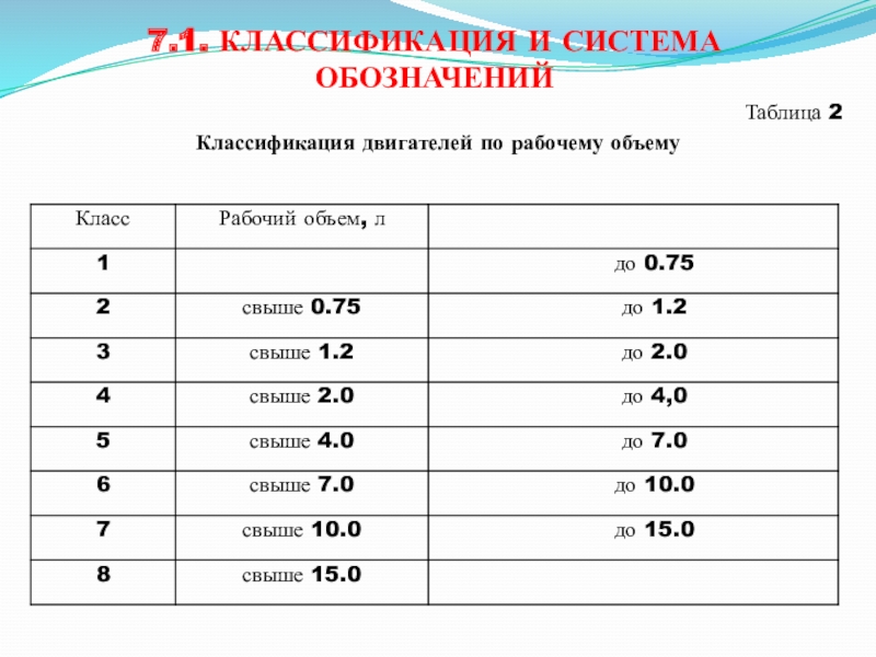 Первая цифра индекса определяет класс двигателя в зависимости от его рабочего объема (табл.2).