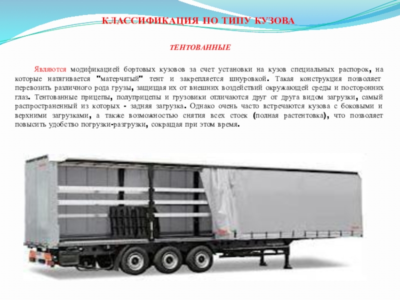кузов специальных распорок, на которые натягивается "матерчатый" тент и закрепляется шнуровкой. Такая конструкция позволяет перевозить различного рода грузы, защищая их от внешних воздействий окружающей среды и посторонних глаз. Тентованные прицепы, полуприцепы и грузовики отличаются друг от друга видом загрузки, самый распространенный из которых - задняя загрузка. Однако очень часто встречаются кузова с боковыми и верхними загрузками, а также возможностью снятия всех стоек (полная растентовка), что позволяет повысить удобство погрузки-разгрузки, сокращая при этом время.