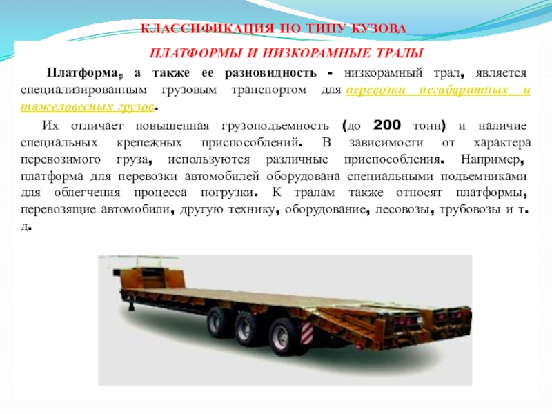 - низкорамный трал, является специализированным грузовым транспортом для перевозки негабаритных и тяжеловесных грузов.