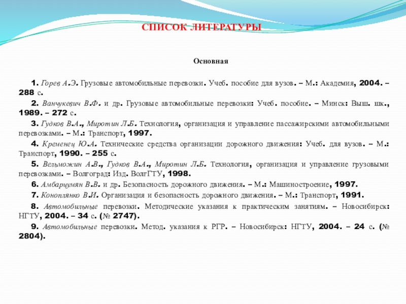 1. Горев А.Э. Грузовые автомобильные перевозки. Учеб. пособие для вузов.