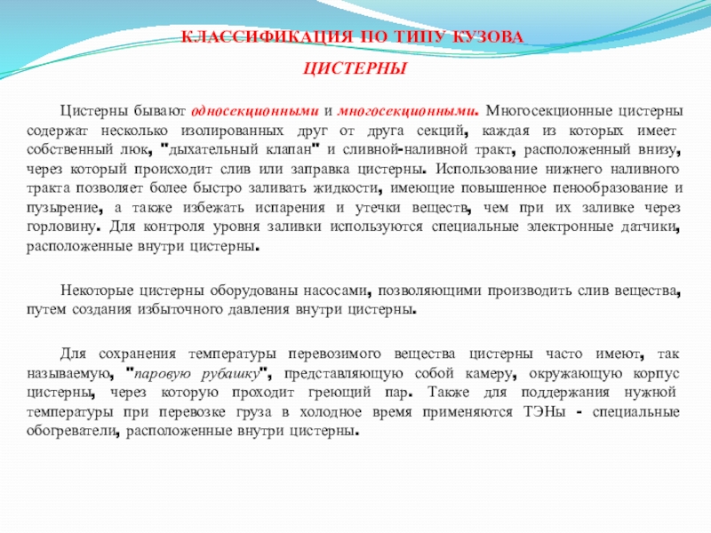Цистерны бывают односекционными и многосекционными. Многосекционные цистерны содержат несколько изолированных друг