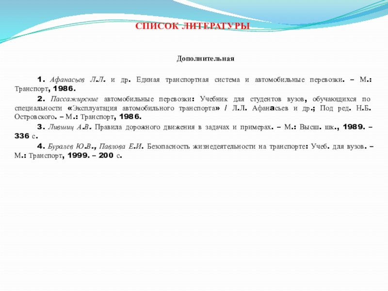 2. Пассажирские автомобильные перевозки: Учебник для студентов вузов, обучающихся по специальности «Эксплуатация автомобильного транспорта» / Л.Л. Афанaсьев и др.; Под ред. Н.Б. Островского. – М.: Транспорт, 1986.