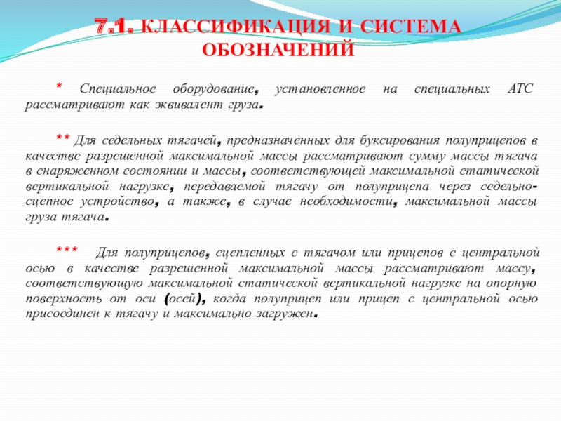 *** Для полуприцепов, сцепленных с тягачом или прицепов с центральной осью в качестве разрешенной максимальной массы рассматривают массу, соответствующую максимальной статической вертикальной нагрузке на опорную поверхность от оси (осей), когда полуприцеп или прицеп с центральной осью присоединен к тягачу и максимально загружен.