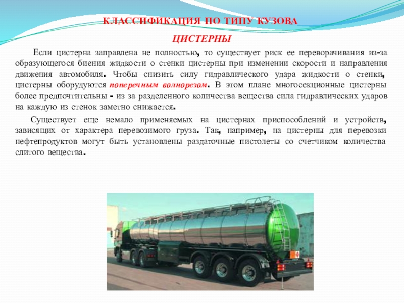 ее переворачивания из-за образующегося биения жидкости о стенки цистерны при изменении скорости и направления движения автомобиля. Чтобы снизить силу гидравлического удара жидкости о стенки, цистерны оборудуются поперечным волнорезом. В этом плане многосекционные цистерны более предпочтительны - из за разделенного количества вещества сила гидравлических ударов на каждую из стенок заметно снижается.
