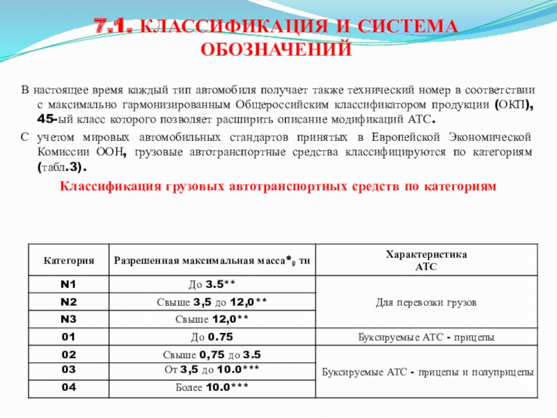 С учетом мировых автомобильных стандартов принятых в Европейской Экономической Комиссии ООН, грузовые автотранспортные средства классифицируются по категориям (табл.3).