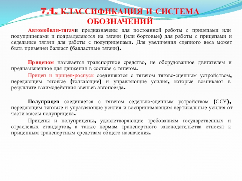 или полуприцепами и подразделяются на тягачи (или бортовые) для работы с прицепами и седельные тягачи для работы с полуприцепами. Для увеличения сцепного веса может быть применен балласт (балластные тягачи).