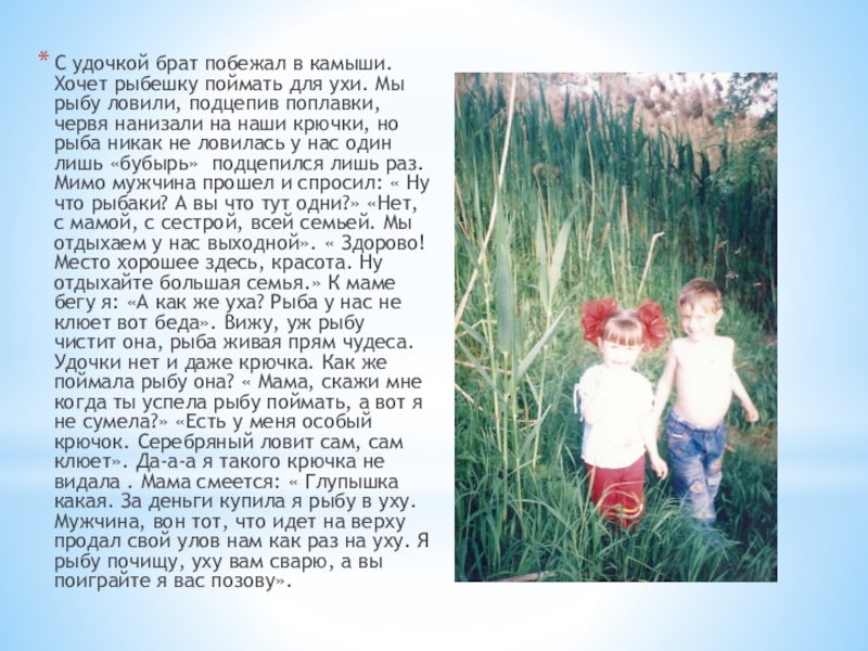 Слайд 5С удочкой брат побежал в камыши. Хочет рыбешку поймать для ухи.