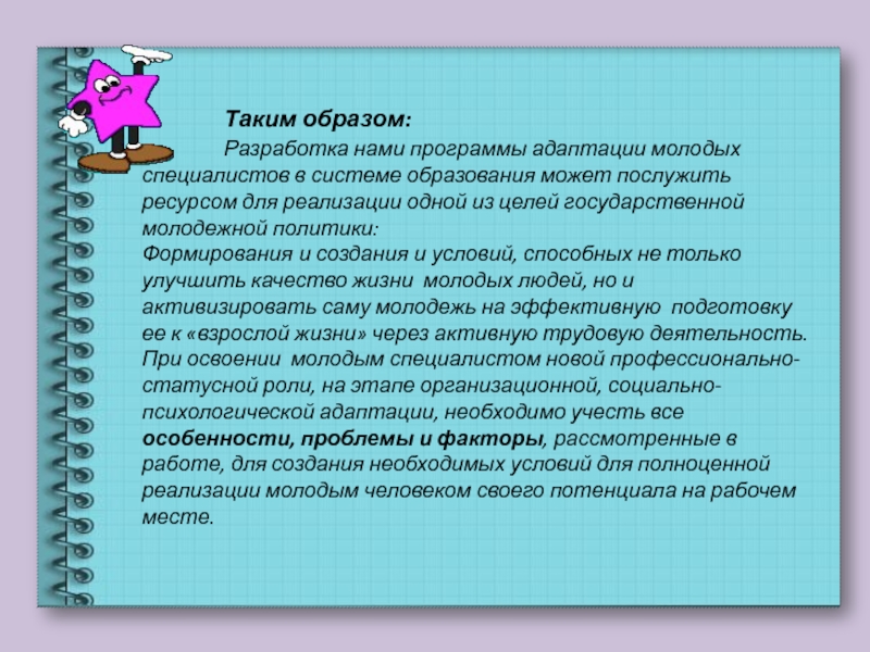 Разработка нами программы адаптации молодых специалистов в системе образования может послужить ресурсом для реализации одной из целей государственной молодежной политики: