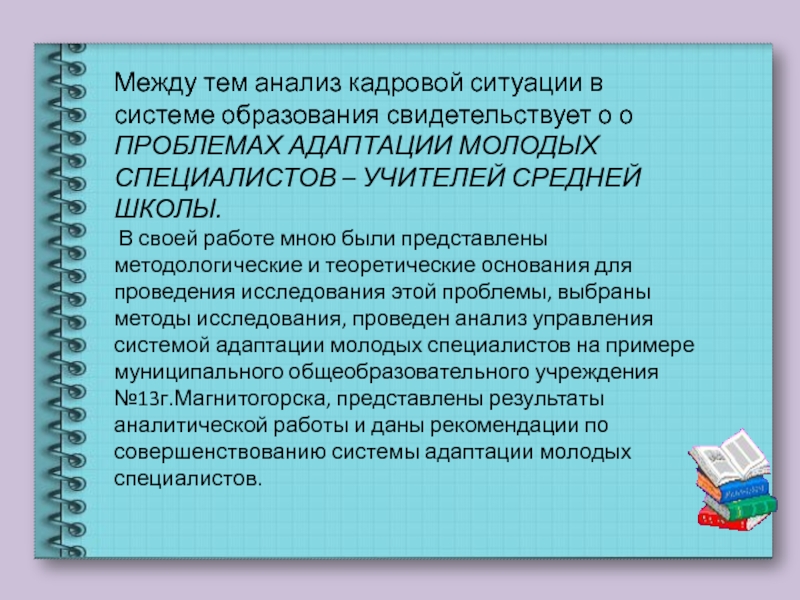 В своей работе мною были представлены методологические и теоретические основания для проведения исследования этой проблемы, выбраны методы исследования, проведен анализ управления системой адаптации молодых специалистов на примере муниципального общеобразовательного учреждения №13г.Магнитогорска, представлены результаты аналитической работы и даны рекомендации по совершенствованию системы адаптации молодых специалистов.