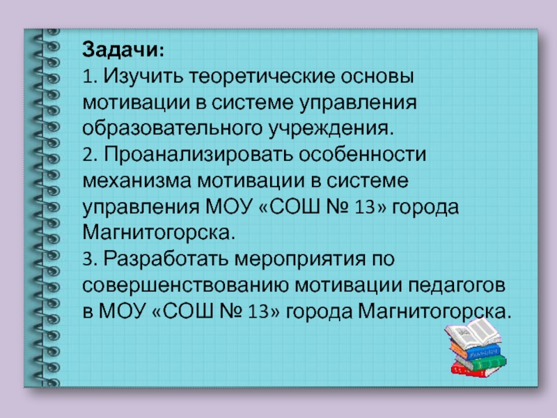 1. Изучить теоретические основы мотивации в системе управления образовательного учреждения.