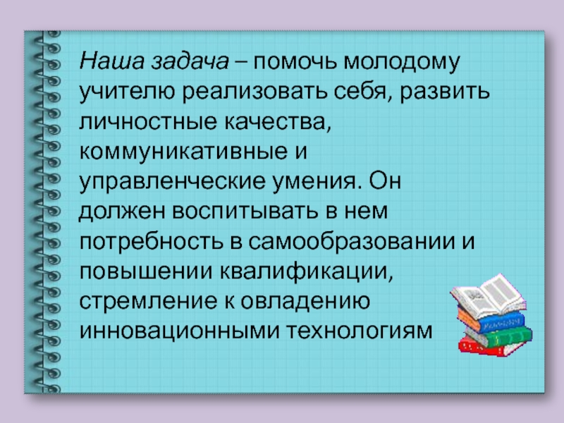 Слайд 9Наша задача – помочь молодому учителю реализовать себя, развить личностные качества,